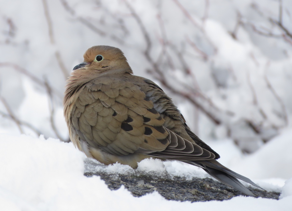 Nesting: They nest on the limbs of conifers or occasionally in shrubs. They are minimalist nest builders, assembling a loose, untidy platform of twigs and plant stems. Mourning Doves often have multiple broods in a season – another reason for their high numbers. In the Backlands, where they nest, male Mourning Doves frequently use the limb of a dead-standing Jack Pine as a ‘call perch’ from which they can be heard from half a kilometer away or more. Though a migratory bird, many overwinter in the province and at the Urban Farm of Spryfield a small group can be observed most winters.